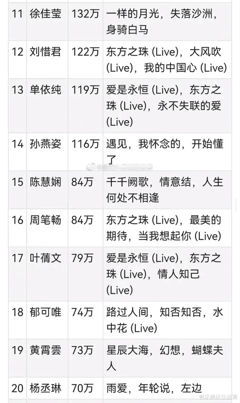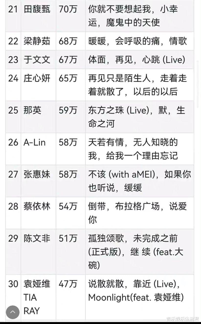 田馥甄排在第21名,单日收听人数。于文文第22名,张惠妹第27名,蔡依林第28名。