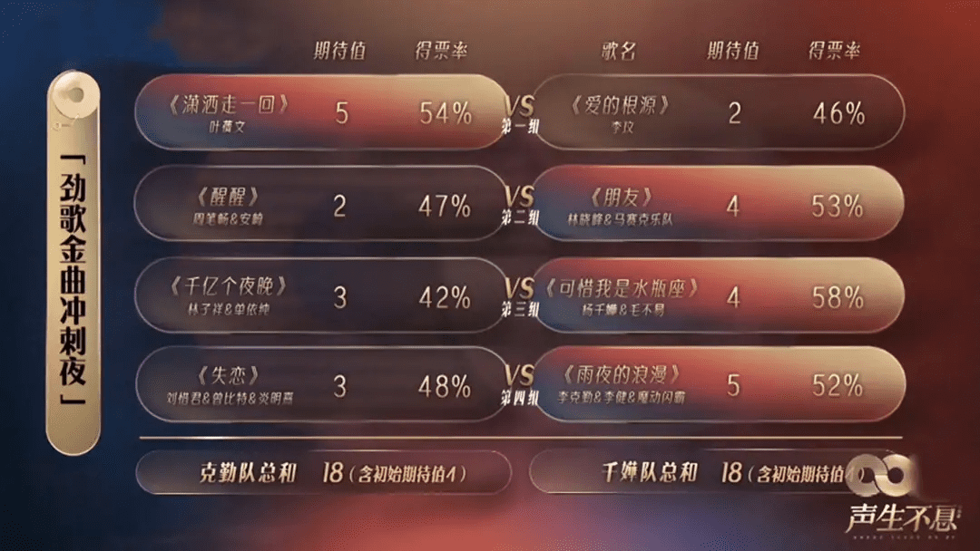 最后一场表演事关金曲盛典出线名额,因此两队更加全力以赴,纷纷使出拿手大招,力求突破想要赢得比赛。经过四轮的比拼后,两队竟奇迹般的以18:18的比分,再次打成平手。因此19组歌手全员进入收官之夜。本来观众还因最后的淘汰赛制感到不满,没想到是虚惊一场。连毛不易都直言“好假”,但确实很戏剧。