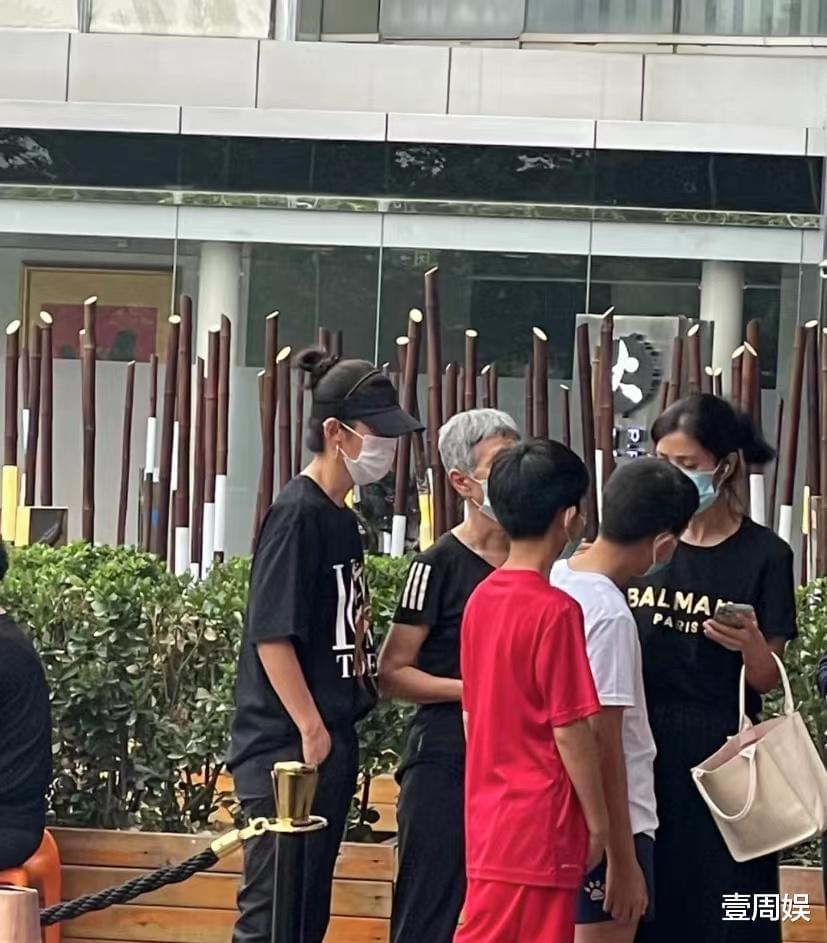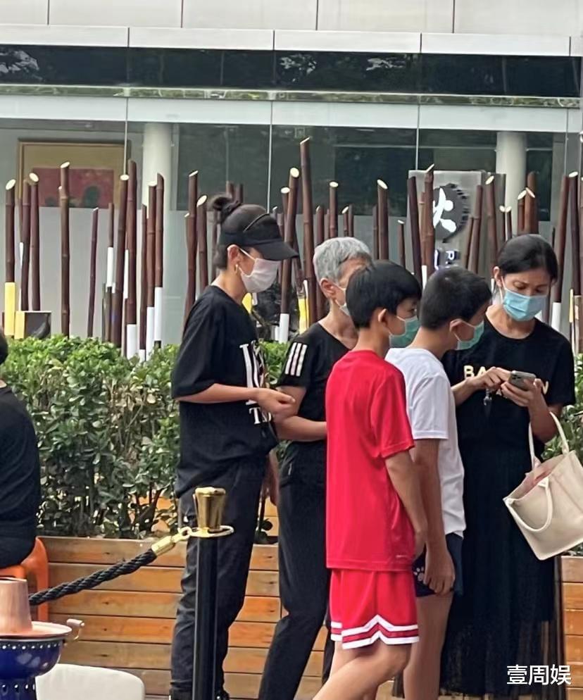 画面中的李冰冰戴着黑色遮阳帽,跟白色的口罩,穿着黑色的休闲T恤站在后面,两只手插兜,满头白发的是她的母亲,也是穿着休闲的T恤出门,旁边还有她的妹妹李雪,手里拎着白色的包,两个儿子长高了不少。
