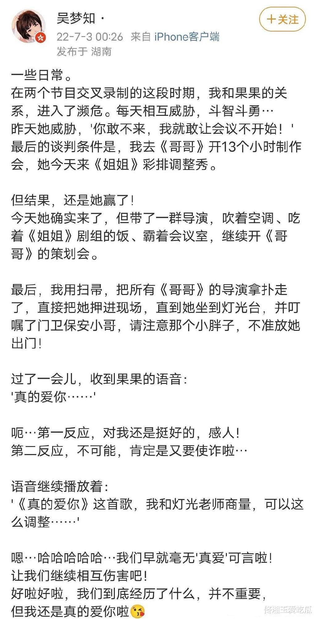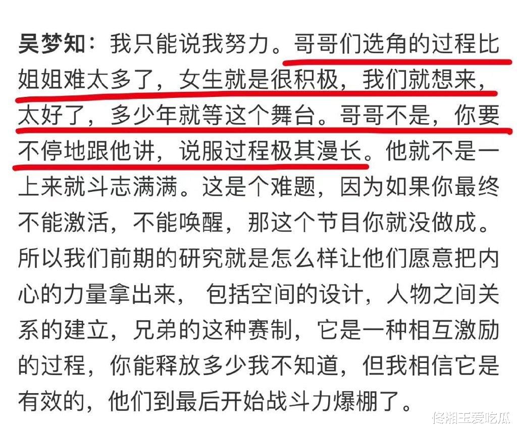这些文字也传递着吴梦知对这份工作的热情,不难看出她很认真在对待自己手上的项目。而在今天凌晨,吴梦知发微博吐槽了最近忙碌的工作,表示《披荆斩棘的哥哥》即将开启,让她有些分身乏术了,就在她正负责着浪姐3下一场的公演时,另外一位导演果果让她去参加《披巾斩棘的哥哥》的制作会。