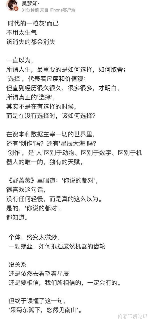 吴梦知立刻把这些人全都赶走了。后来吴梦知还写下了一段话,“在资本和数据主宰一切的世界,还有创作吗?”。