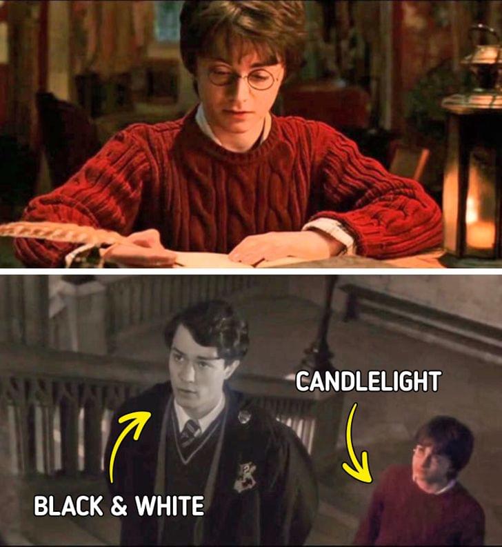 哈利波特进入日记的场景,刚开始他在一个烛光照亮的房间里看日记,后来进入了日记的世界,周围的一切都变成了黑白的,只有他依然被烛光照亮,或许暗示着这一切都是他自己想象出来的。