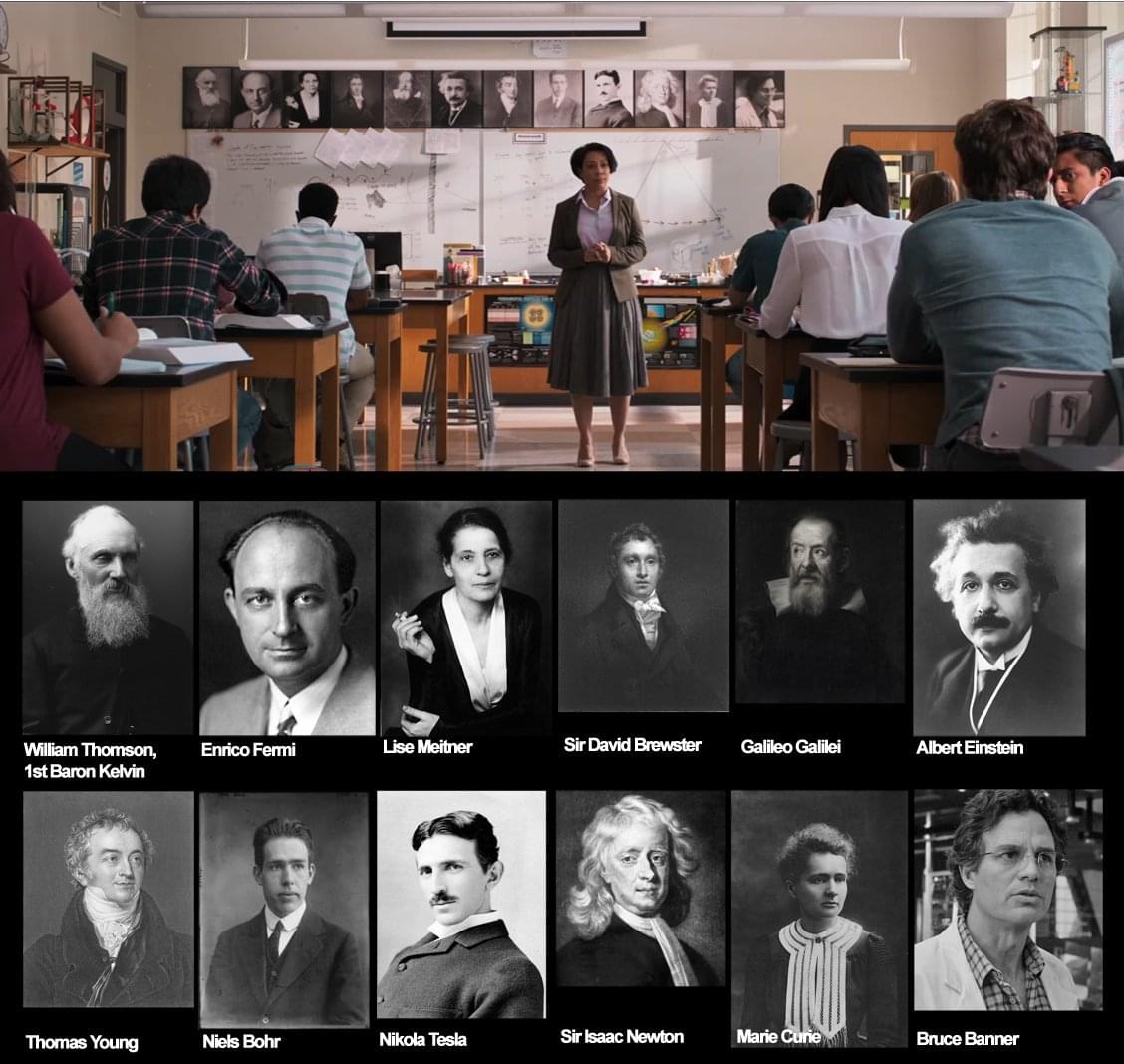 在物理教室的墙上,挂着一排著名科学家的肖像,除了爱因斯坦、特斯拉这些人之外,还有漫威宇宙的科学家布鲁斯·班纳,也就是著名的绿巨人。