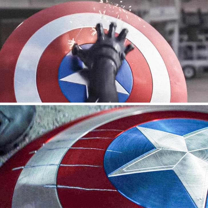 美国队长的振金盾牌几乎坚不可摧,但是在与黑豹战斗时,盾牌上却留下了很深的划痕,这些特写镜头想要告诉观众,黑豹可以损坏美队的振金盾牌,原因是他其实也装备了振金。