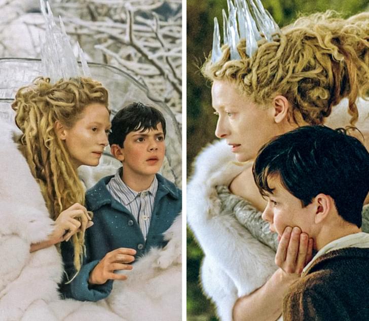 白魔女的冰冠在开场时看起来又长又尖,随着时间的推移,她的冰冠变得越来越小,这表明她的力量像冰冠一样在融化减弱,到片尾处已经变得非常弱小了。