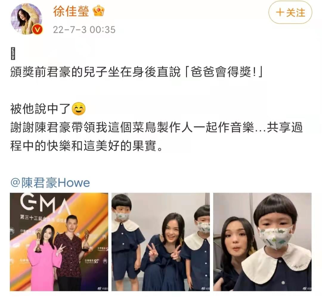 徐佳莹和陈君豪靠合作的《以上皆非》获得了最佳单曲制作人奖,徐佳莹在得奖后还凌晨在社交软件上分享了后台的趣事,称陈君豪的儿子一早就料到自己的爸爸会得奖。