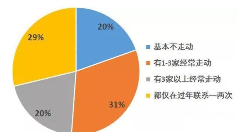 一份调查显示,32%左右的人只与1到3家亲戚互动频繁;20%左右的人拥有3家以上的要好亲戚;29%左右的人没有要好的亲戚且一年走动次数屈指可数;超过20%的人几乎没有亲戚。