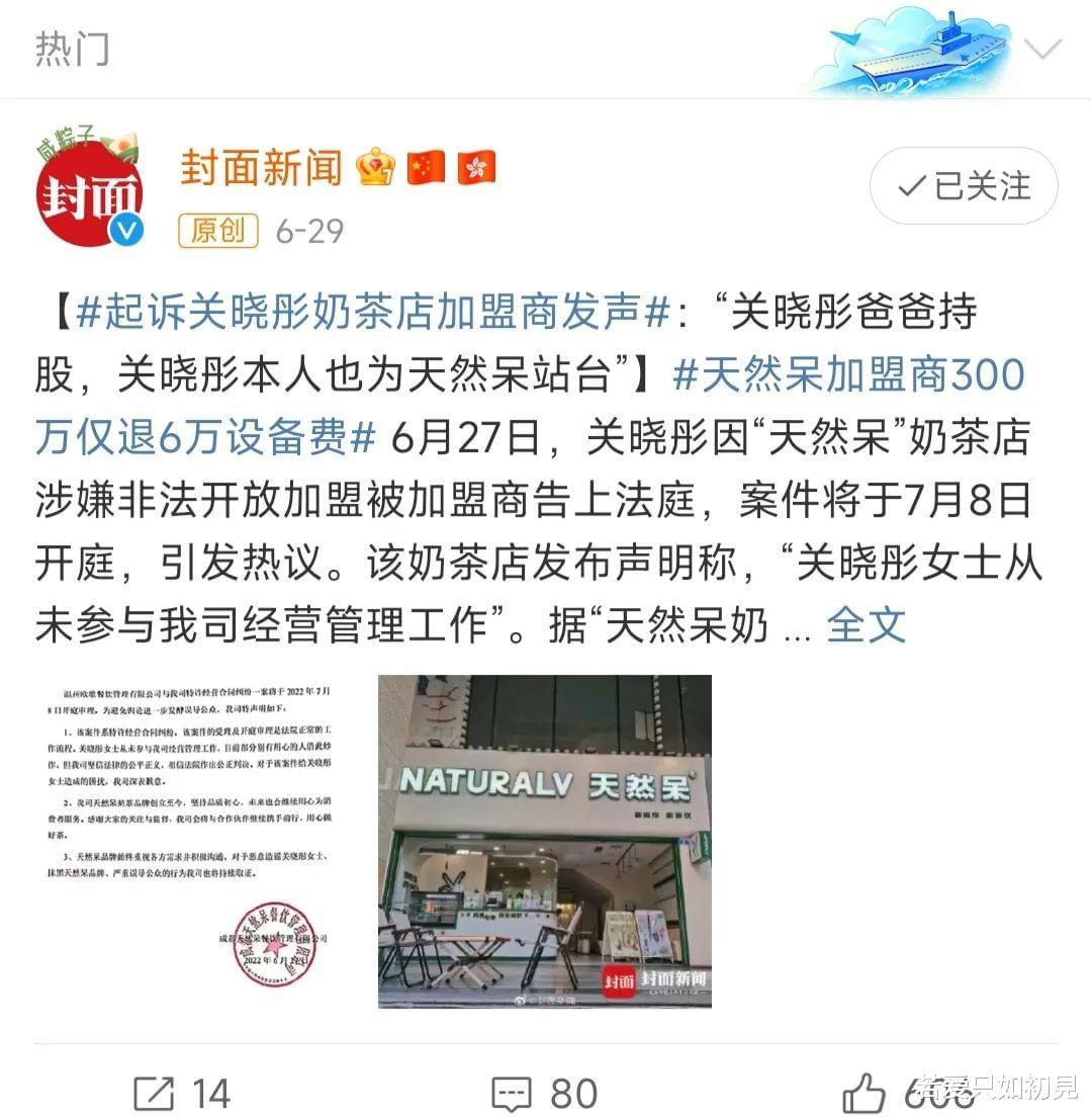 而后,天然呆发布声明称关晓彤从未参与经营管理,极力撇清关晓彤与此事的关系,国民格格成功“甩锅”。