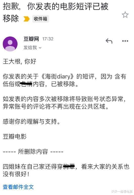 然后今年6月底,豆瓣说王大根的那条评论低俗瑟瑟,然后被删除了。一条被影片导演肯定的评论就这样被删了!