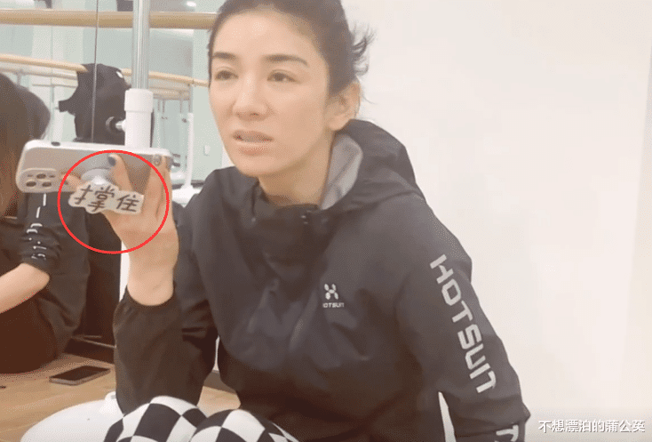 黄奕练习过后坐在地板上休息,近景下法令纹很深,44岁真实年龄感已经挡不住,不过黄奕的五官还是很立体,尤其双眼皮很优秀。另外黄奕当时在手机后面安了一个小支架,上面写着“撑住”,真的很要强啊。