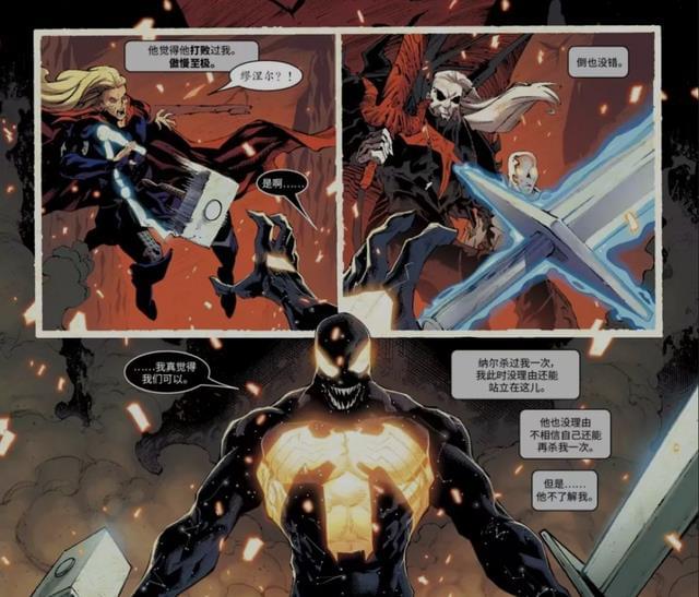 正是这种属性buff的加持,之后的毒液很轻松的就获取了雷神之锤的加持,并且漫画中这一状态下的毒液还将其与银影侠的滑板融合成了对抗纳尔的终极武器!