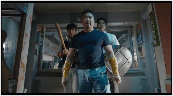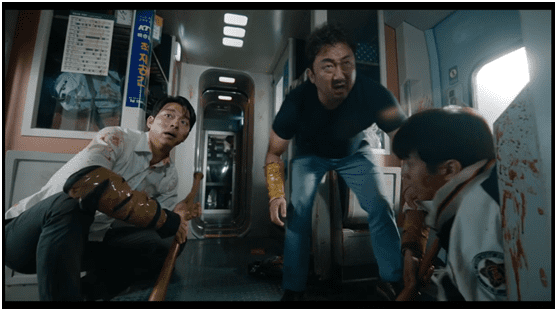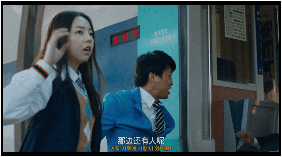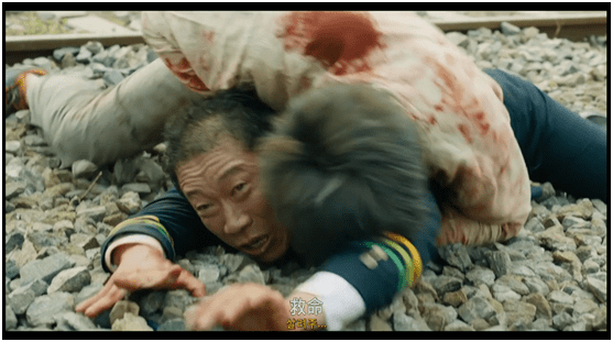 影片中有一段小高潮,是相华联合石宇和棒球少年闵英国(崔宇植扮演),组成三人团队,几乎赤手空拳的与车厢内众多的丧尸抗衡。