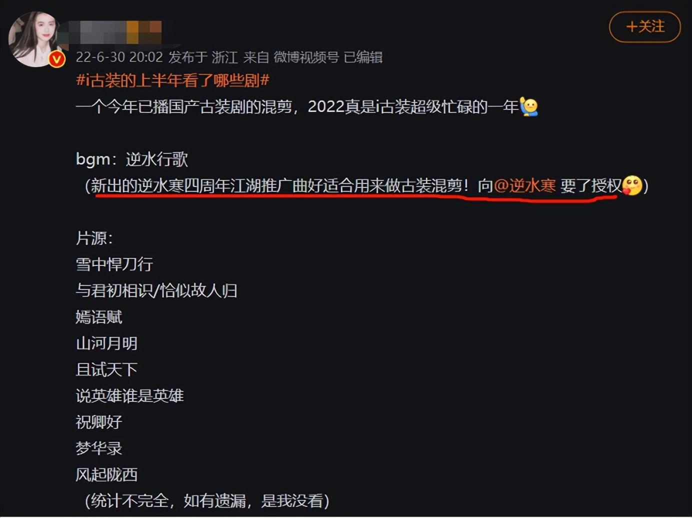 原来,当2022年圆满结束,有古偶剧爱好者制作了“已播国产古装剧的混剪”,挑来看去,UP主竟然选中了网易古风网游《逆水寒》四周年江湖推广曲《逆水行歌》来做BGM。