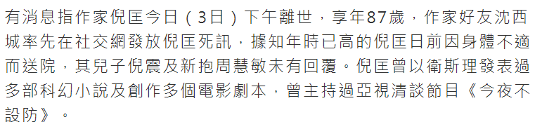 7月3日,港媒报道,作家沈西城在社交网公布倪匡死讯,称著名作家倪匡在7月3日下午离世,享年87岁。