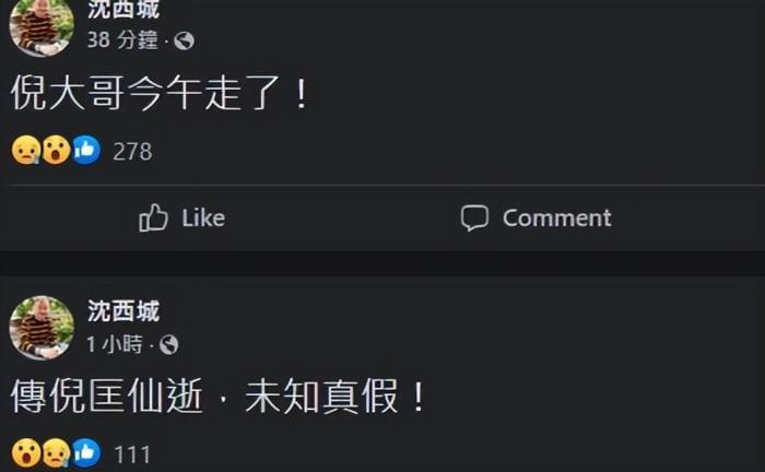 沈西城一开始表示,“传倪匡仙逝,未知真假”,一小时后即再发文,“倪大哥今午走了!”透露倪匡离世消息。