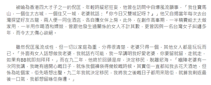虽然倪匡风流成性,但一切以家庭为重,“经常有女人说要做我的老婆,我说没有可能,因为我很爱太太,不会离婚,如果你怀孕了,我们立即分手。”