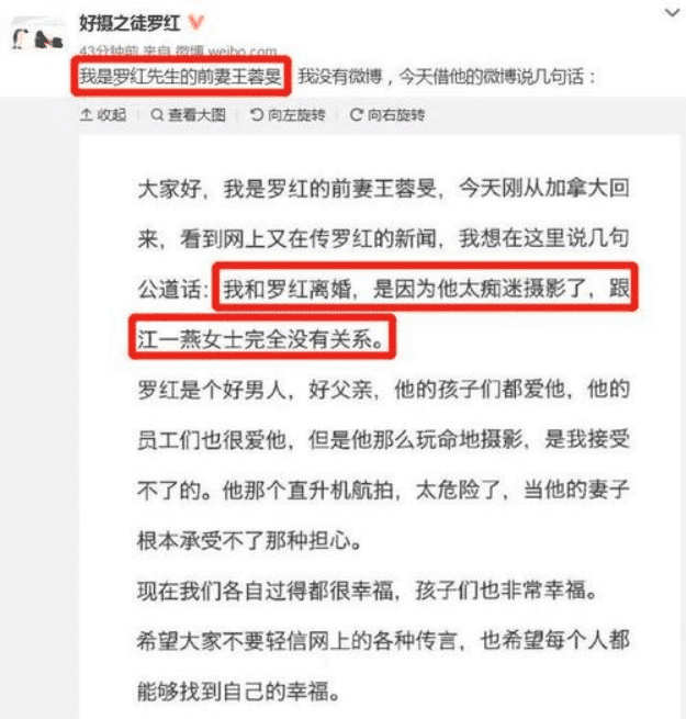 随即而来的,就是江一燕是第三者的传言,就在大家讨论的激烈时,原配依然没有出来发声,可背地里,罗红的妻子却提出了分手。