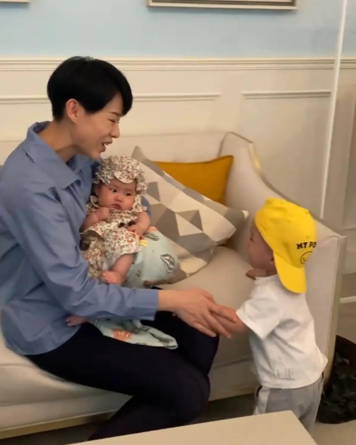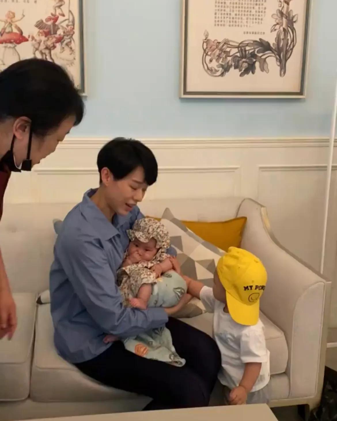 只见奕宏头戴黄色棒球帽,身穿白色t恤,打扮看起来酷酷的。他走到妈妈身边,看到妈妈怀里抱着小妹妹,先是小心翼翼地轻轻摸了下小妹妹的胳膊,然后就开始吃醋了,边晃着身子边哼出快哭的声音,撒娇模样太可爱,简直太逗了。