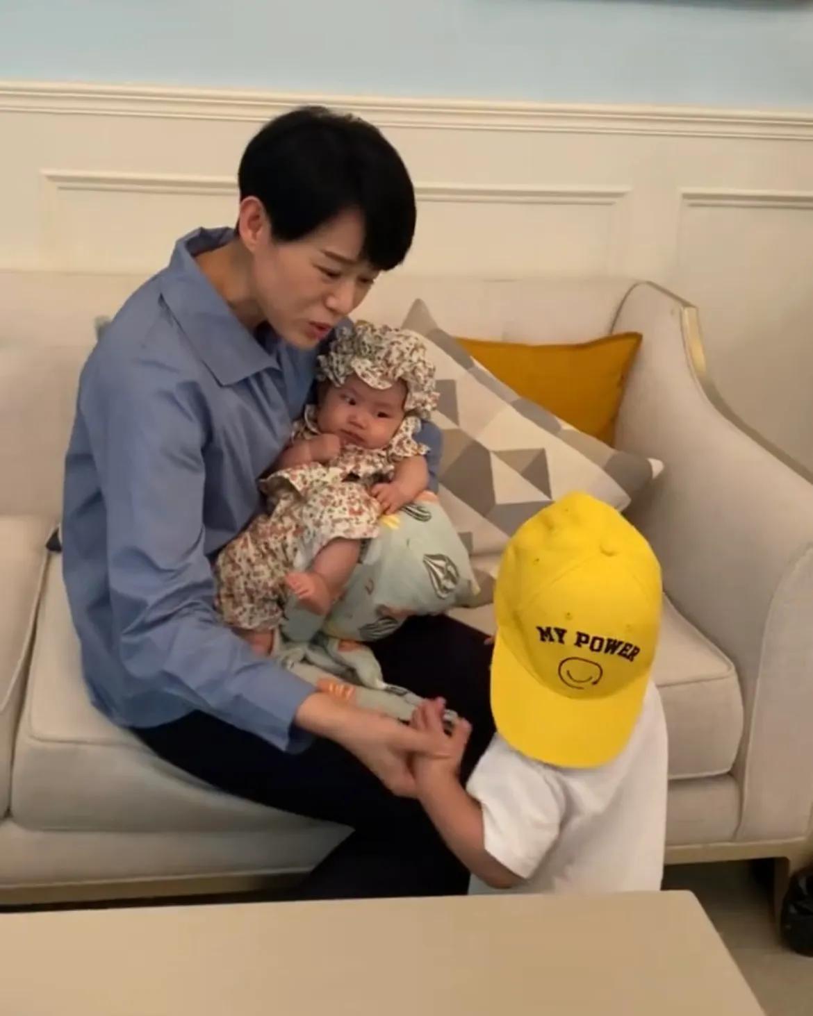 画面中,身穿蓝色衬衫和黑色长裤,一身打扮十分朴素,她坐在沙发上,怀里抱着一个穿着碎花小衣服的女宝宝,看起来母爱满满,满眼温柔。没想到现实中有三个儿子的胡杏儿在剧里圆了女儿梦。