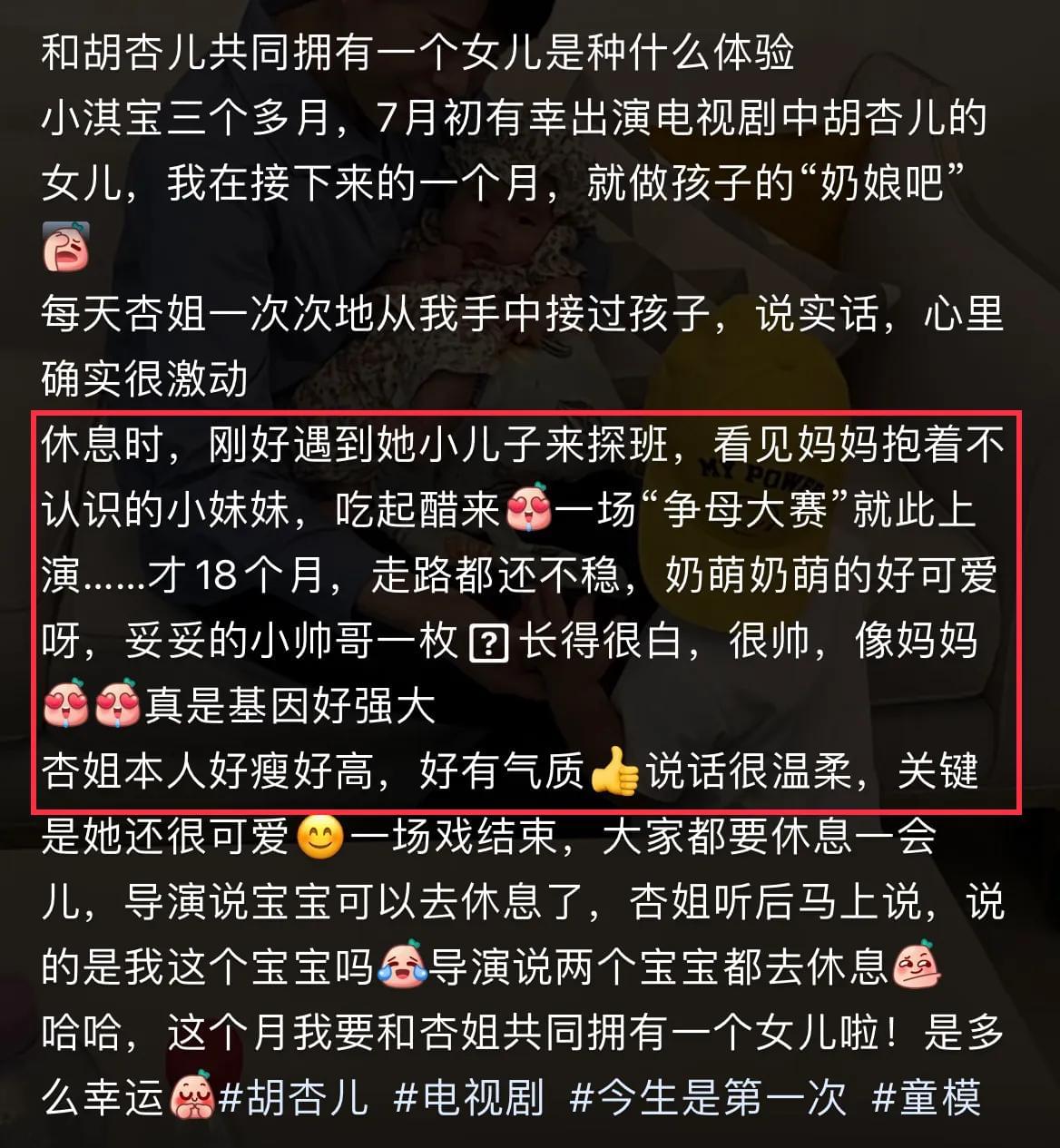 网友表示,在休息的时候,刚好胡杏儿的三胎小儿子李奕宏到现场探班,看到妈妈抱着不认识的小妹妹,不仅吃醋还上演了一场“争母大赛”。网友说18个月的奕宏走路还不稳,奶萌奶萌的很可爱,是妥妥的小帅哥一枚,长得白还很帅,跟妈妈胡杏儿很像。