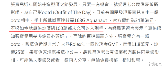 不过话说回来,很多女艺人喜欢买名牌包包等升值,而男艺人则选择买名表。像一些三线女艺人都买很多名牌包包,而袁伟豪都是TVB一线了,太太张宝儿也家境不错,还投资有道,对于他们来说买这些应该不是很难。