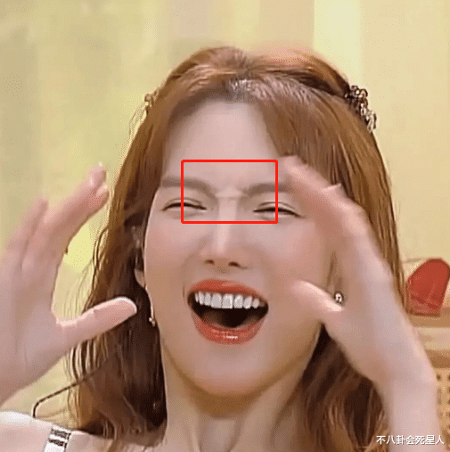 普通人做皱眉耸鼻的表情,只会在眉头有些竖向纹路。而金晨的脸上却没有什么自然的皮肤纹理,倒是鼻梁和眉心中间,高耸起了一个突出的截断,乍一看就像鼻梁里被塞了硬物“假体”。