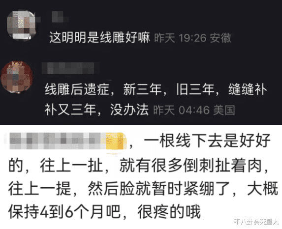 有人指出,秦岚脸上的痕迹并不是巴掌印,更像是去做了脸部“线雕”留下的痕迹。所谓线雕就是在脸上做倒刺,提拉达到面部紧致的效果,过程很疼,但保质期几个月左右。