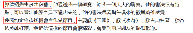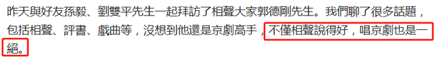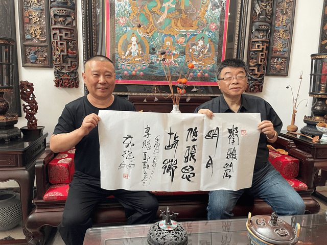据悉,当天邱毅和郭德纲相谈甚欢,两人在很多方面的观点都十分一致,拜访完毕后,邱毅还书写长文大赞郭德纲,直言他多才多艺,不仅相声说得好,京剧唱的也是一绝,不仅如此,书法也有着独特的韵味。