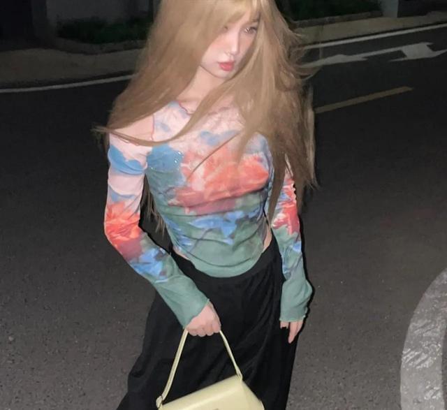 虞书欣穿着漂染长袖上衣,搭配黑色宽松休闲裤,简单的手提包,氛围感满满。