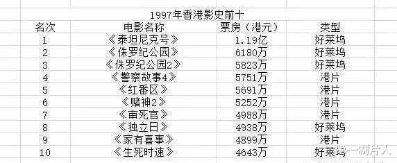 1993年,香港电影市场遭遇了好莱坞电影冲击,这年周星驰出产了7部影片,可在港的总成绩还不如好莱坞一部《侏罗纪公园》。眼见阵地失守,1994~1996年,周润发与成龙轮流发力,《赌神2》《红番区》等电影多次夺得年冠,抢回第一的宝座。就在大众以为香港电影即将赶上好莱坞了,1997年的《泰坦尼克号》用1.19亿的票房成绩将这个可能性彻底摧毁,这一年不止《泰坦尼克号》,紧接着暑假档的《侏罗纪公园2:失落的世界》以5823万港元的票房成绩将只有4542万港元票房成绩的香港本土电影《一个好人》挤到第三的位置。