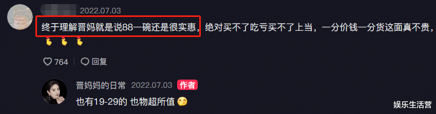 有粉丝看完广告后表示,终于理解晋妈妈说88一碗还是很实惠了。不过这也透露出晋妈妈面馆的价格,走的是中高端价格,一碗面88元,这价格看上去就很吓人了,多少也是一套衣服的钱呀。