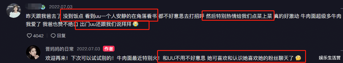 晋妈妈也证实李勒优却是在店中,称和李勒优不用不好意思,他很喜欢和认识她喜欢她的粉丝聊天。晋妈妈的话引起了喜欢李勒优的粉丝们的热情回应,不少网友称,真想去店里吃。