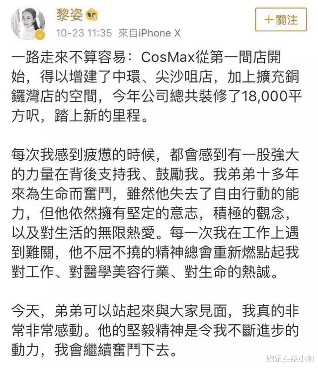 黎姿还专门发文感谢弟弟没有放弃站起来的希望,
