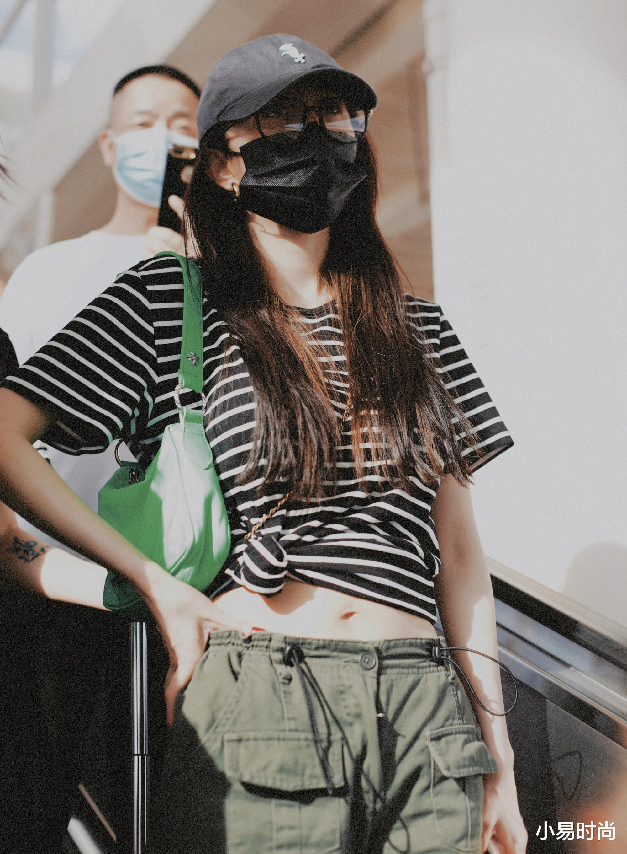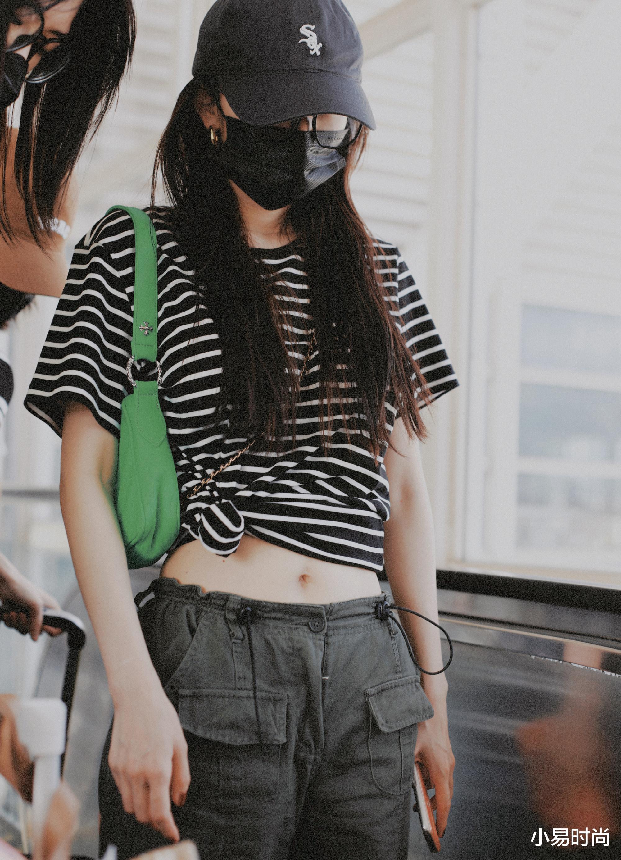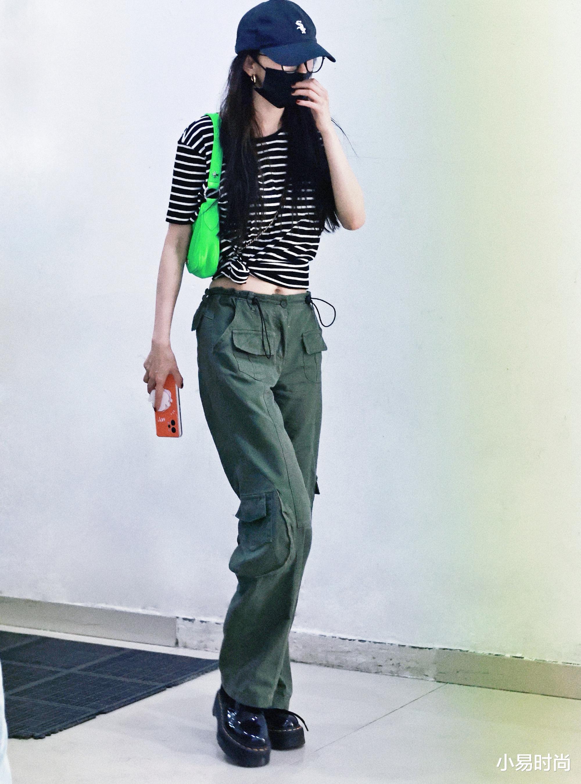 简单的黑色与绿色的交织,在整体的气质表达上其实是非常完美的表达。圆润的线条领口搭配上常规一点的版型设计,能让T恤的穿搭显得更加的温柔。而我们想要穿出这样普通的T恤,只需在穿搭之中,像是杨幂一样选择这样的小心机穿搭即可,例如腰部系上一个小小的结,展现出完美的腰部线条,真的很出彩的。