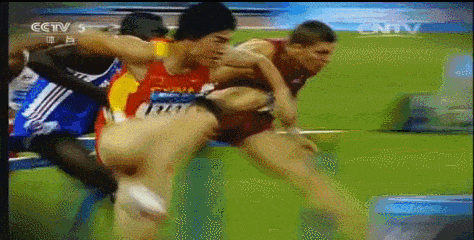 2012年伦敦奥运会,刘翔在跨越第一道栏时摔倒,跟腱断裂。