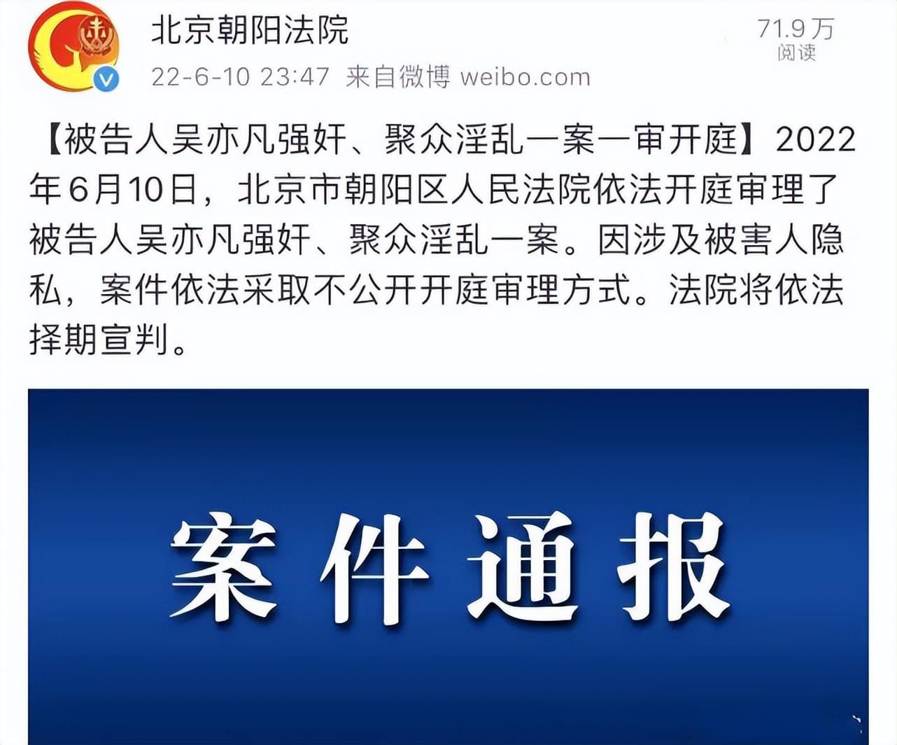 据官方消息称,吴亦凡案一审已经审完了,因涉及被害人隐私,案件采取了不公开审理的方式,法院也将择期宣判。