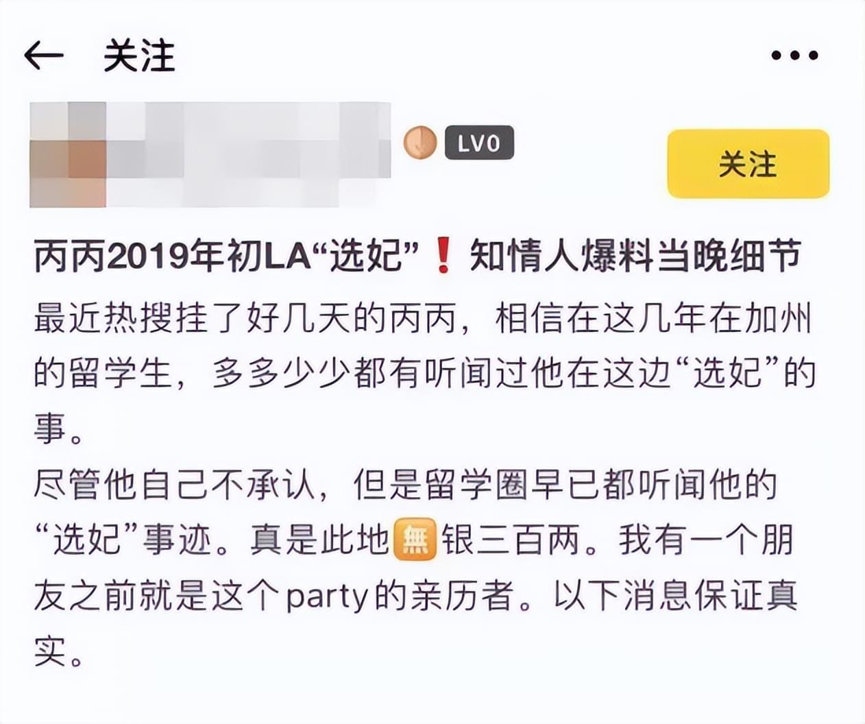 她在帖子里说,吴亦凡在洛杉矶“选妃”早已不是什么秘密,这边留学生多多少少都听说过,而且她的朋友还在不知情的情况下,亲自参加过这样的聚会。