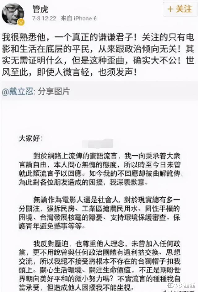 更加魔幻的是,导演管虎不仅转发了戴立忍的澄清说明,还帮对方撑腰“他是一个真正的谦谦君子。”