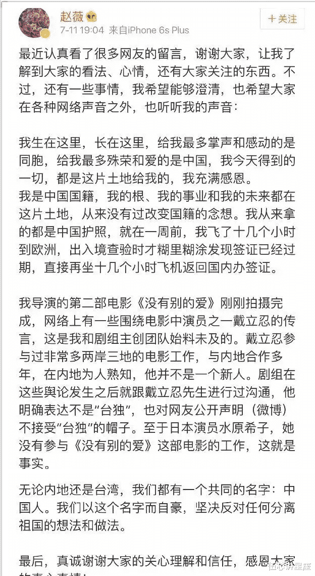 感觉到沉默无法压住民愤之后,6年前的7月11日赵薇首次就和戴立忍合作一事做出了回应。