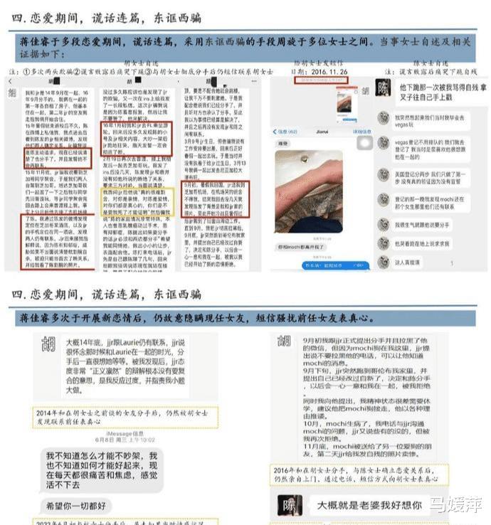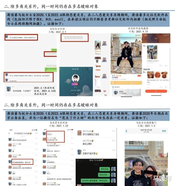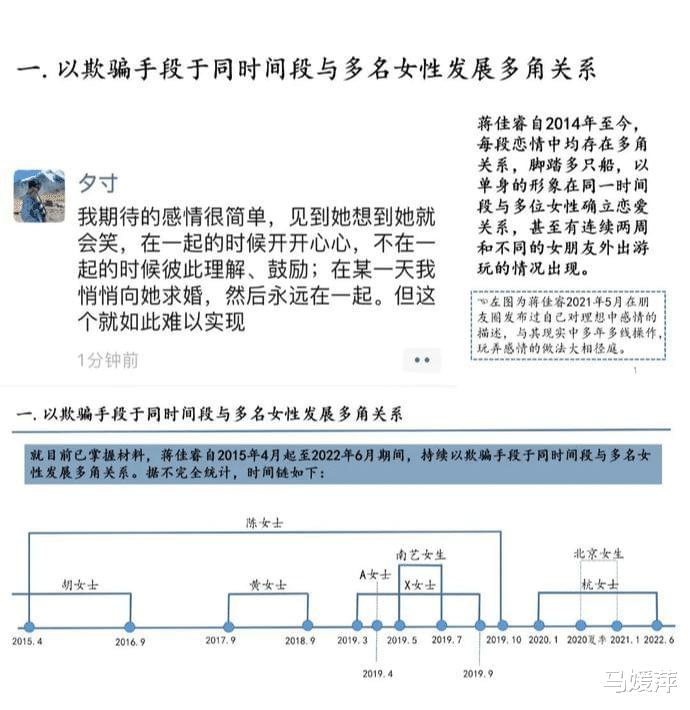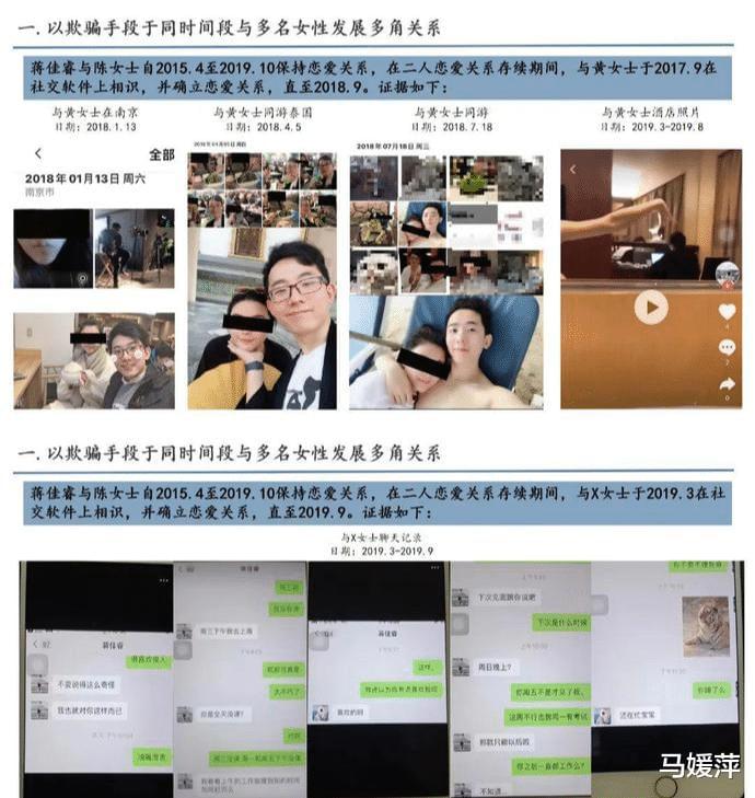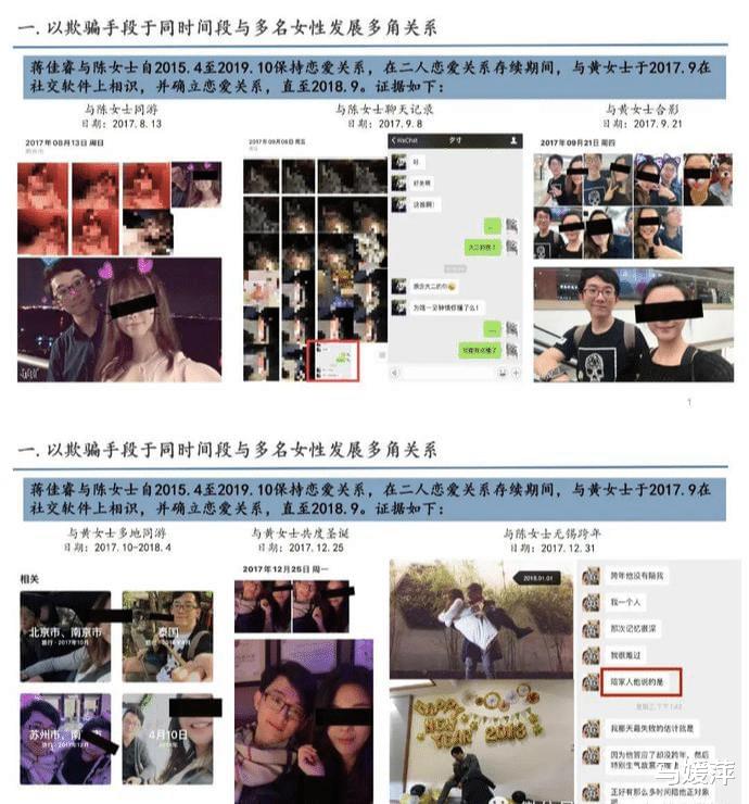 蒋某某自2014年至今,每段恋情中均存在多角关系,脚踏多只船,以单身的形象在同一时间段与多位女性确立恋爱关系,甚至有连续两周和不同的女朋友外出游玩的情况出现。