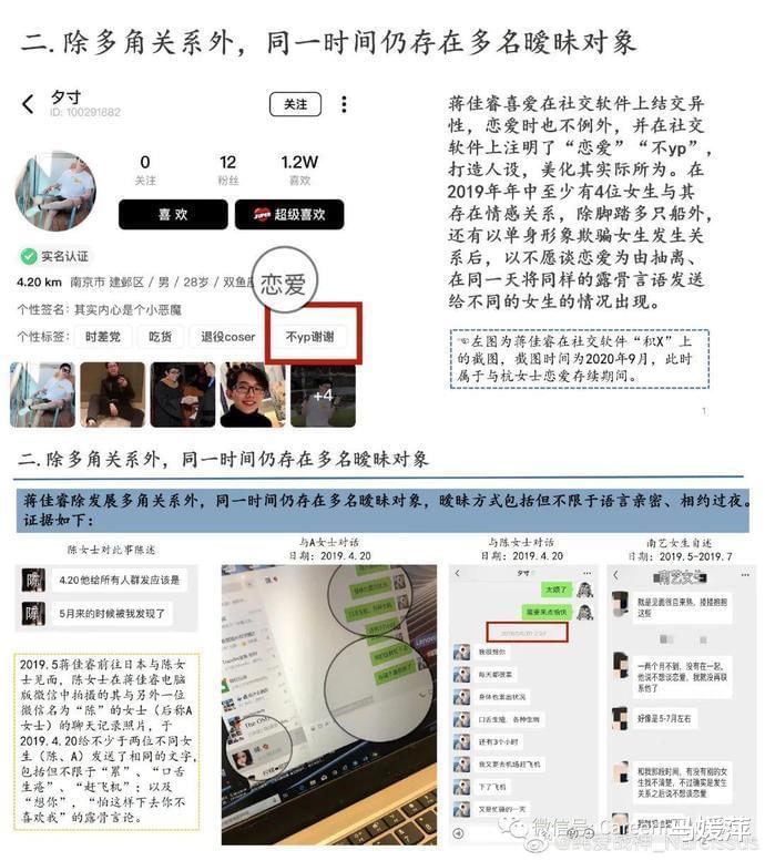 蒋某某喜爱在社交软件上结交异性,恋爱时也不例外,并在社交软件上注明了“恋爱”“不yp”,打造人设,美化其实际所为。在2019年年中至少有4位女生与其存在情感关系,除脚踏多只船外,还有以单身形象欺骗女生发生关系后,以不愿谈恋爱为由抽离、在同一天将同样的露骨言语发送给不同的女生的情况出现。