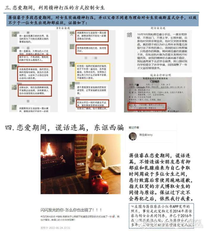 该网友还称,蒋某某持续以欺骗手段于同时间段与多名女性发展多角关系;除多角关系外,同一时间仍存在多名暧昧对象;恋爱期间,利用精神打压的方式控制女生……基于此,该网友对蒋某某予以举报,并为此制作了逻辑清晰、图文详实的PPT。