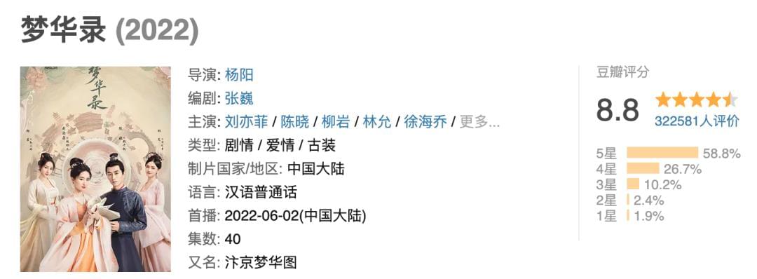 终于在寂寞了许久的内地影视市场迎来一个现象级的爆款《梦华录》在内地电视剧豆瓣评分中都拿到8.8的高分