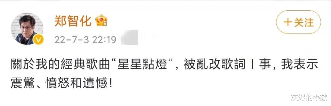 近日,在浪姐3的三公舞台上,王心凌组(王心凌、阿娇、阿sa、张天爱和吴谨言)对歌手郑智化的经典曲目《星星点灯》进行改编,郑智化于7月3日深夜发文怒斥,称对此感到震惊、愤怒与遗憾。