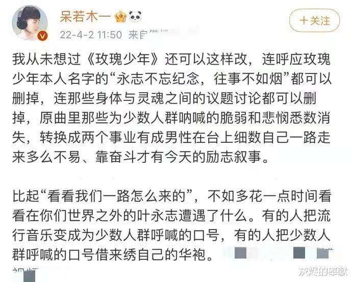 蔡依林的《玫瑰少年》也被周深和Gai进行过颠覆原版的演绎,对此还有乐评人站出来发声,说此番魔改把歌曲中的人物原型都删掉了,实为不妥。
