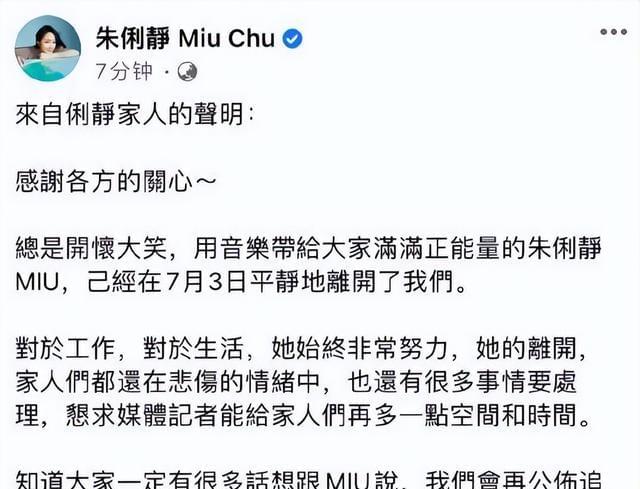 朱俐静离开的消息传出后,她的家人通过社交软件发出声明证实噩耗,声明中透露,总是开怀大笑又充满正能量的朱俐静,已经在7月3日平静地离开了我们,对于工作生活,她始终非常努力,她的离开,家人们都还在悲伤的情绪中,还有很多事情要处理,恳求媒体能给家人们再多一点空间和时间。