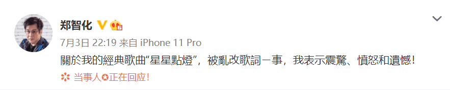然后是三公之后,王心凌组《星星点灯》更改歌词,引发讨论,原唱歌手郑智化发文:“关于我的经典歌曲《星星点灯》被乱改歌词一事,我表示震惊、愤怒和遗憾”。