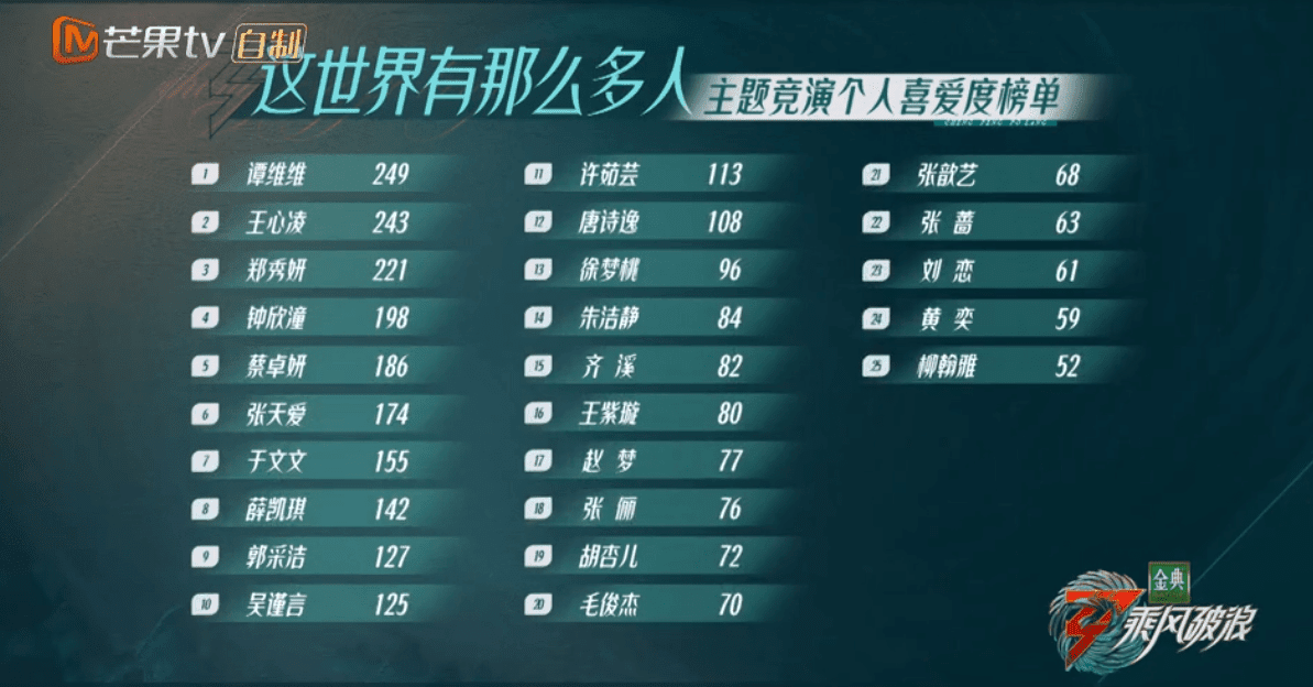 《浪姐3》来到五公,其实对于最终的成团名单来说基本已经明晰,三个队长必然是位列其中,从一公到三公,个人喜爱度榜上都位居TOP3,所以三人必然在其中。