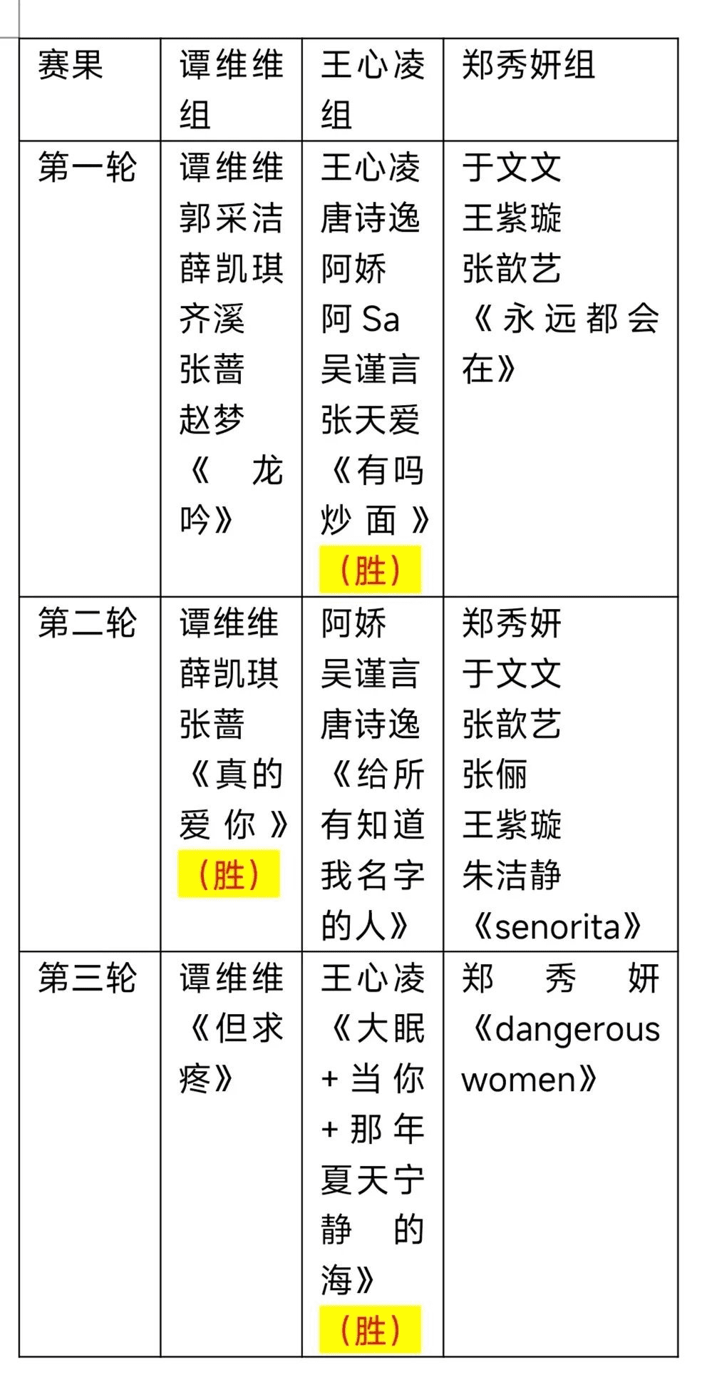整体上,王心凌组拿下两场胜利,谭维维组拿下一场胜利,郑秀妍组三连败。