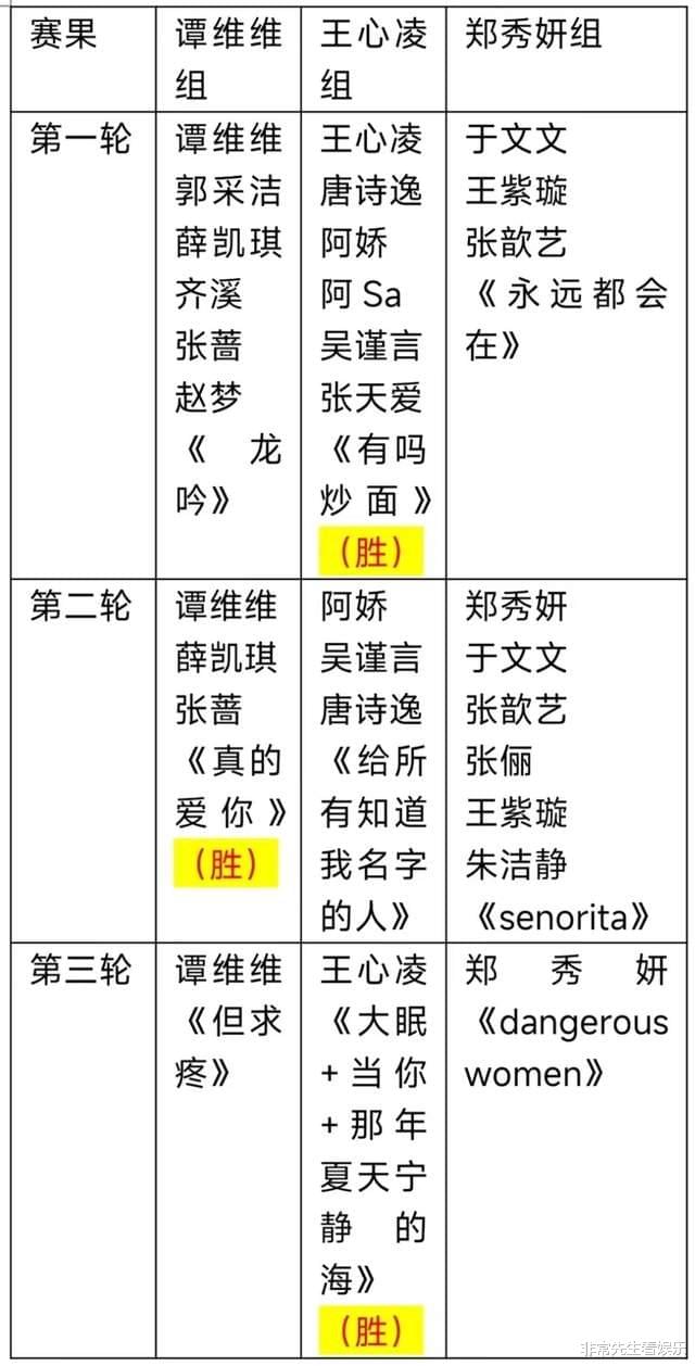 其三:在三轮对决中,王心凌组拿到了两轮胜利,而且是唯一一个守擂成功的团队,谭维维组拿到了一轮胜利,而郑秀妍组输掉了全部三轮比赛,大概率会拆组。